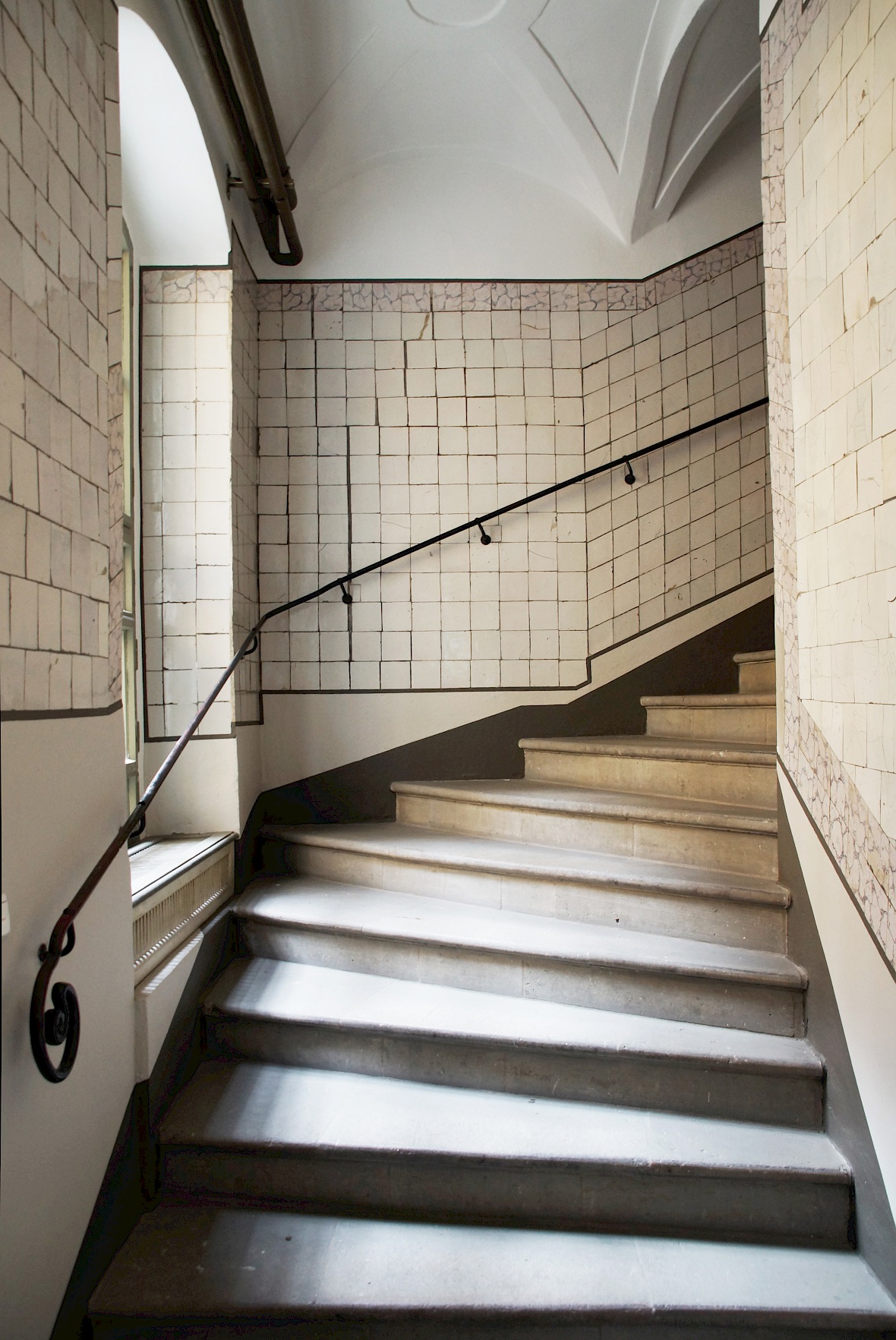 Erforderliche Eingriffe, wie das neue Treppenhaus, wurden klar ablesbar und in einer reduzierten modernen Formensprache entworfen. Hier wurde das Treppengeländer nach historischen Vorlagen im Wasserstrahlverfahren aus patinierten Messingplatten geschnitten.