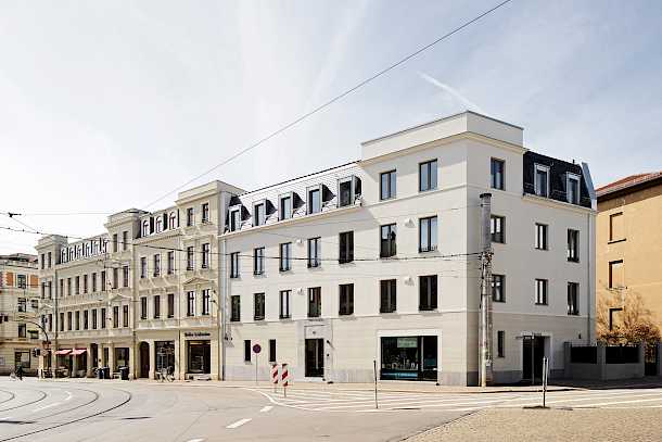 Die moderne Version eines klassischen Stadtwohnhauses vervollständigt nun die durch historische Bauten vorgeprägte Platzsituation um die Friedenskirche.
