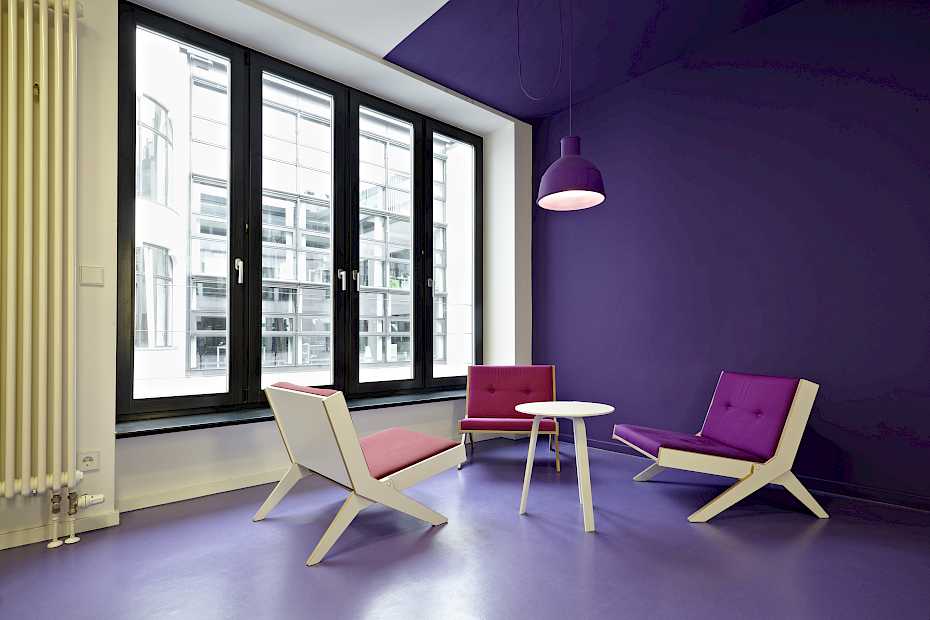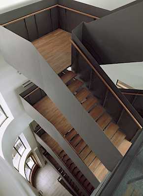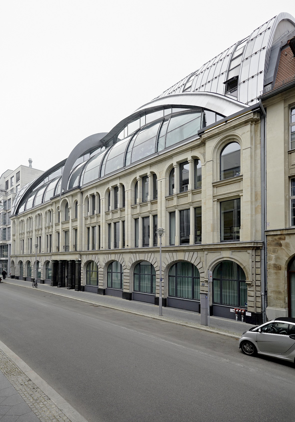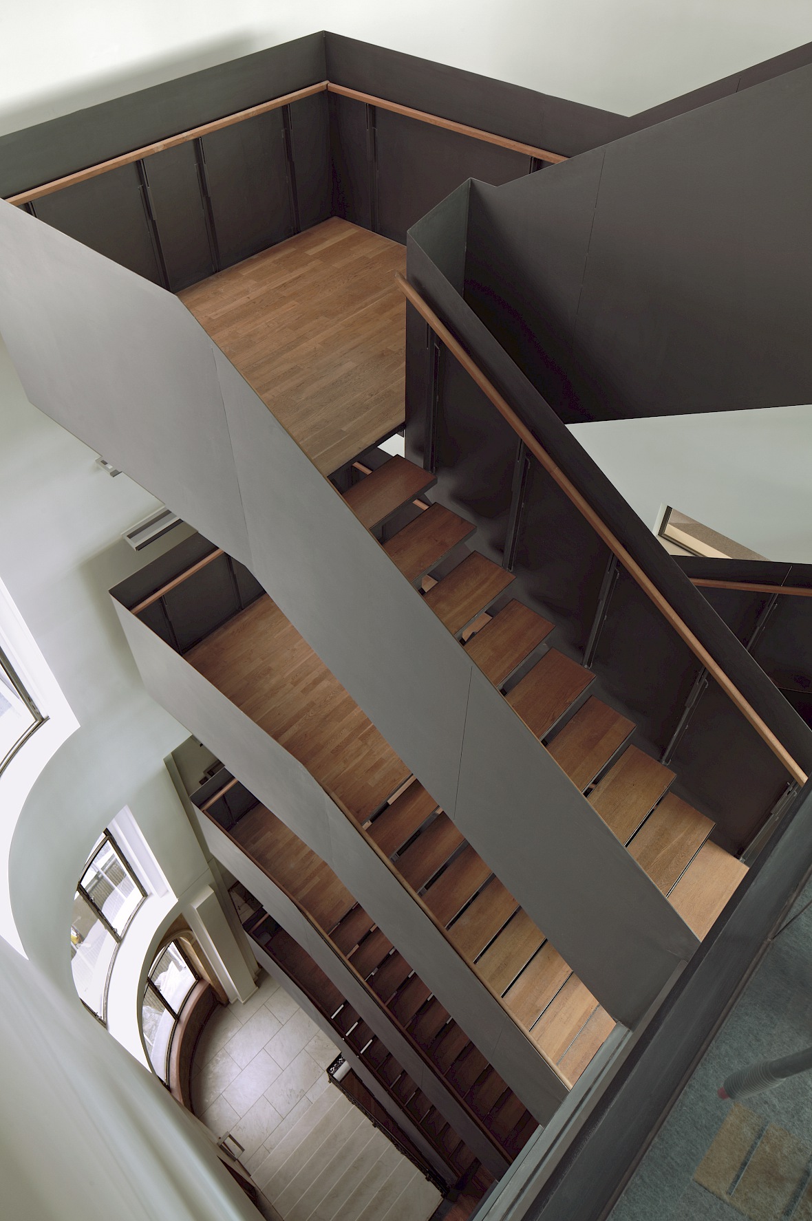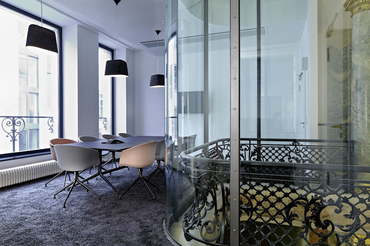 Die Großraumbüros erstrecken sich über sechs Geschosse mit einer Gesamtfläche von ca. 8.500 m² und werden gegliedert durch eingestellte Sonderflächen wie Besprechungsboxen, Copypoints, Teeküchen. Die historische Eingangshalle mit dem prunkvollen Treppenhaus steht im Kontrast zu den modernen und knalligen Büroräumen. Besonders außergewöhnlich ist die Nutzung des gläsernen Gewölbes zur Oberwallstrasse.