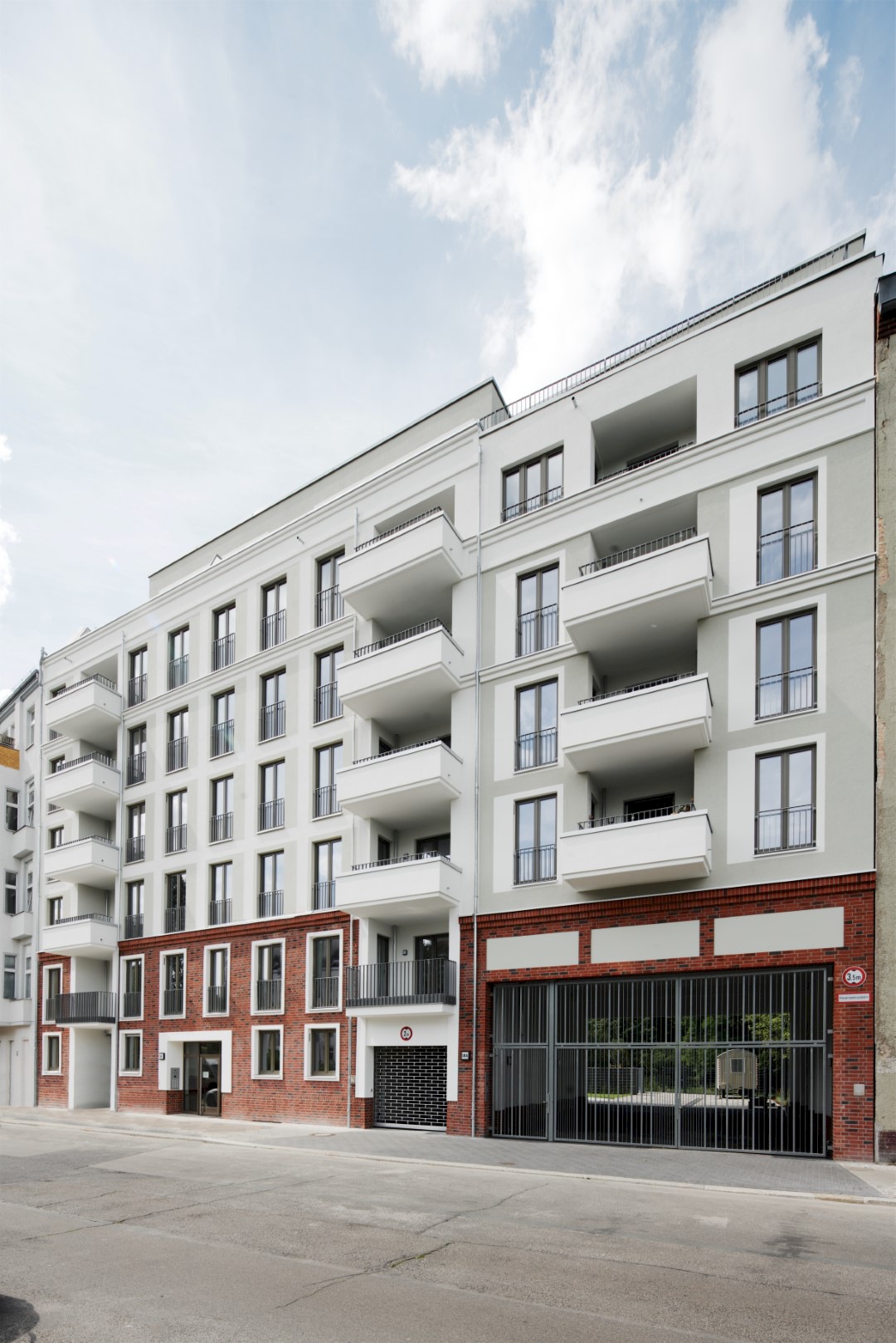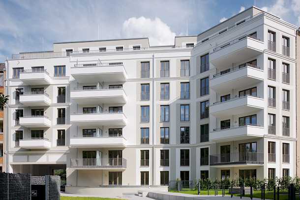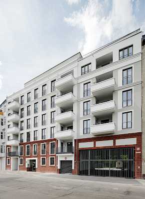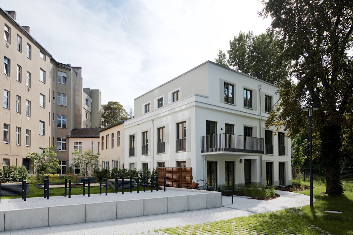 Das Vorderhaus führt die vorhandene Blockrandbebauung fort und das Hinterhaus gliedert sich an eine Bestandsgiebelwand an. Beide Gebäude weisen eine gleiche Architektursprache auf. Das Vorderhaus erhält eine Klinkerriemchen-Sockel, der vom Erdgeschoss bis zum 1.Obergeschoss reicht. Die Obergeschosse erhalten eine Putzoberfläche auf WDVS mit unterschiedlichen Putzqualitäten und Farbgebungen. Die Hinterhausfassade wird vollständig mit einer Putzoberfläche hergestellt und greift dabei die Putzqualitäten und Farbgebungen des Vorderhauses auf.