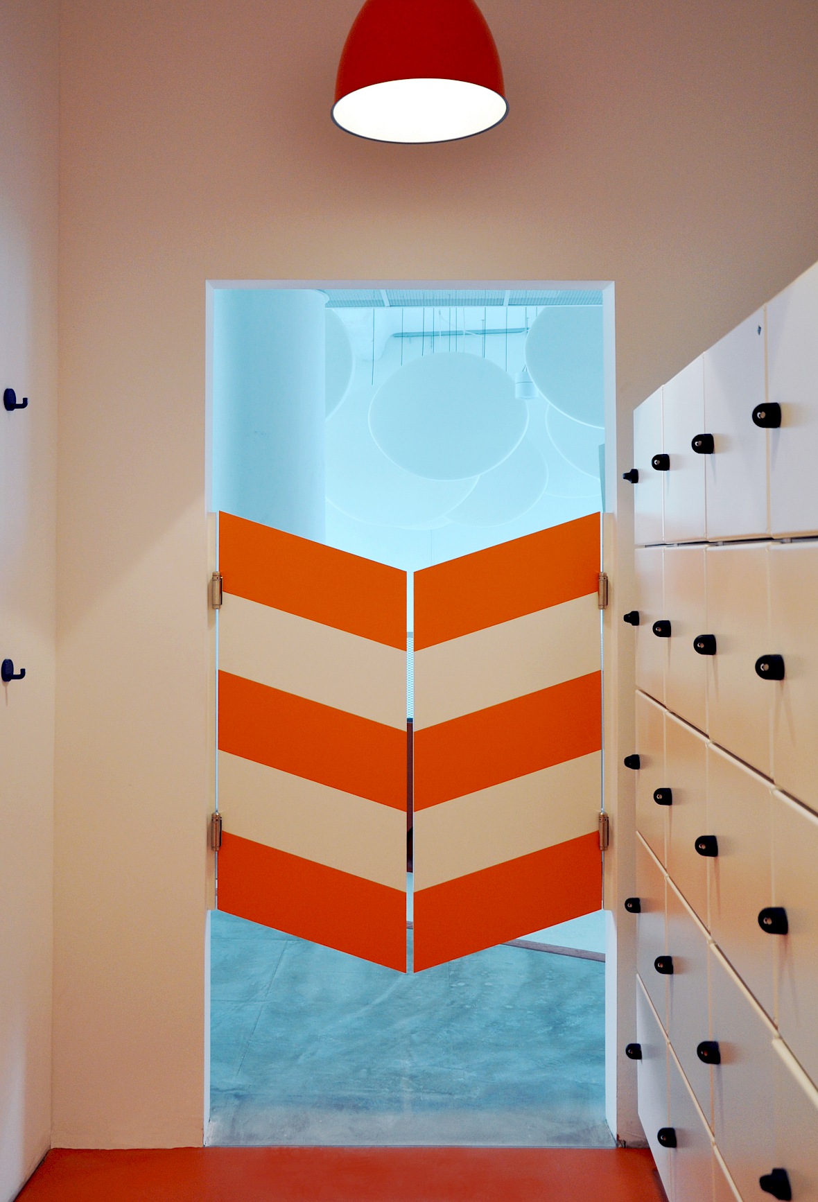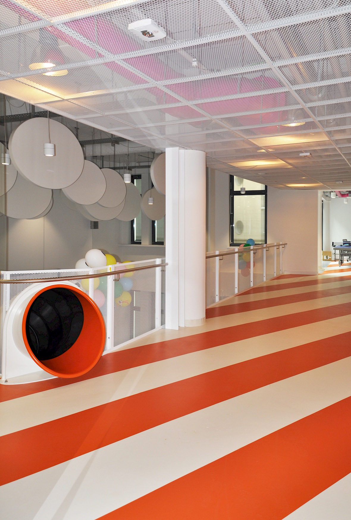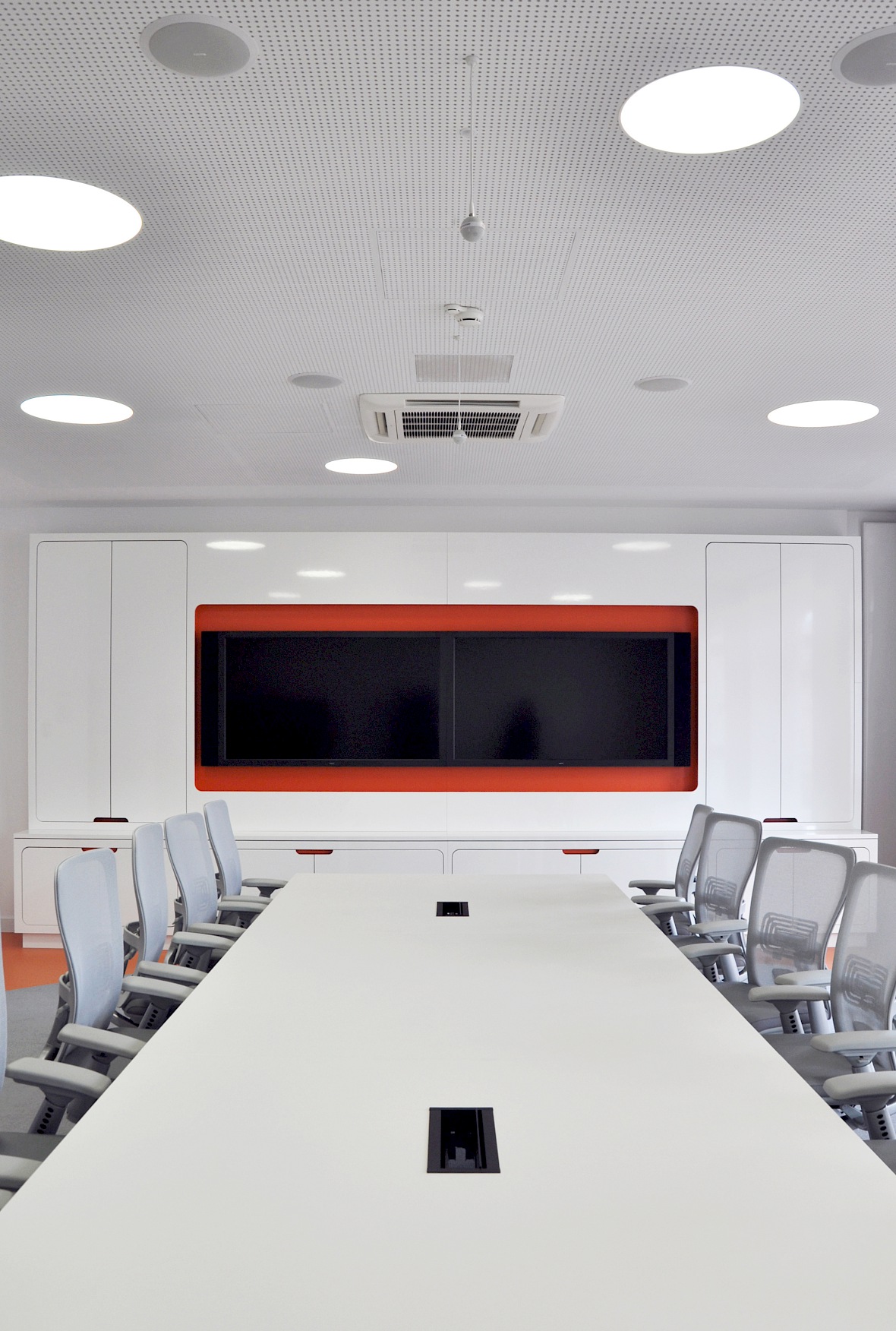 Das Ergebnis sind nach Teams organisierte Großraumbüros mit farbenfrohen Spiel-und Gemeinschaftsflächen, gegliedert durch eingeschobene Glaskuben als Meeting- und Telefonboxen.