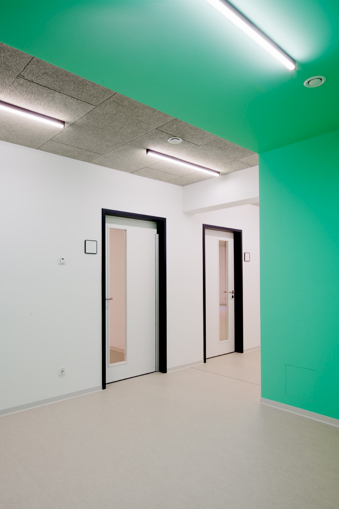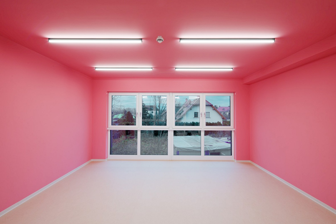 Die Gruppenräume sind farblich bewusst zurückhaltend gestaltet, um die Wände für kreative Basteleien der Kinder freizuhalten. Als spielerisches Element dient die geometrische Anordnung der Beleuchtung, die in den unterschiedlichen Gruppenräumen variiert. Einzelne Leuchtstäbe sind beispielsweise sternförmig oder im Zickzack an der Decke ausgerichtet.