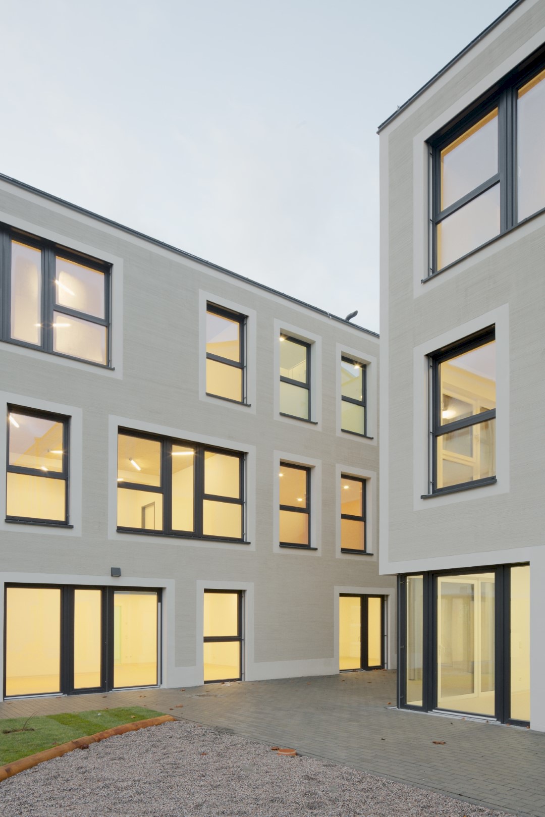 Funktional ordnen sich Flur und Nebenräume an den Außenseiten an, während die Aufenthaltsräume der Kinder zum Garten ausgerichtet sind. Die großzügigen Fensterformate schaffen somit eine lichtdurchflutete und durch Grün geprägte Atmosphäre. Die einzelnen Etagen sind funktional auf Krippe, Kindergarten und Hort aufgeteilt und den Altersstufen entsprechend klar strukturiert.