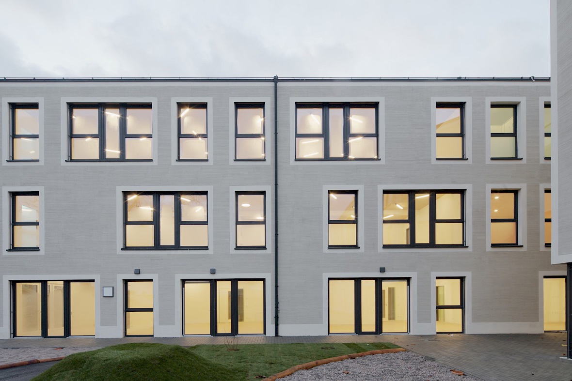 Ein Mittelbau markiert die Eingangssituation und verbindet die beiden im 90-Grad-Winkel zueinanderstehenden Gebäudeteile zu der L-Form, die zur Abschirmung des Lärmpegels für die sensiblen Bereiche, wie Schlaf- und Gruppenräume erforderlich war.