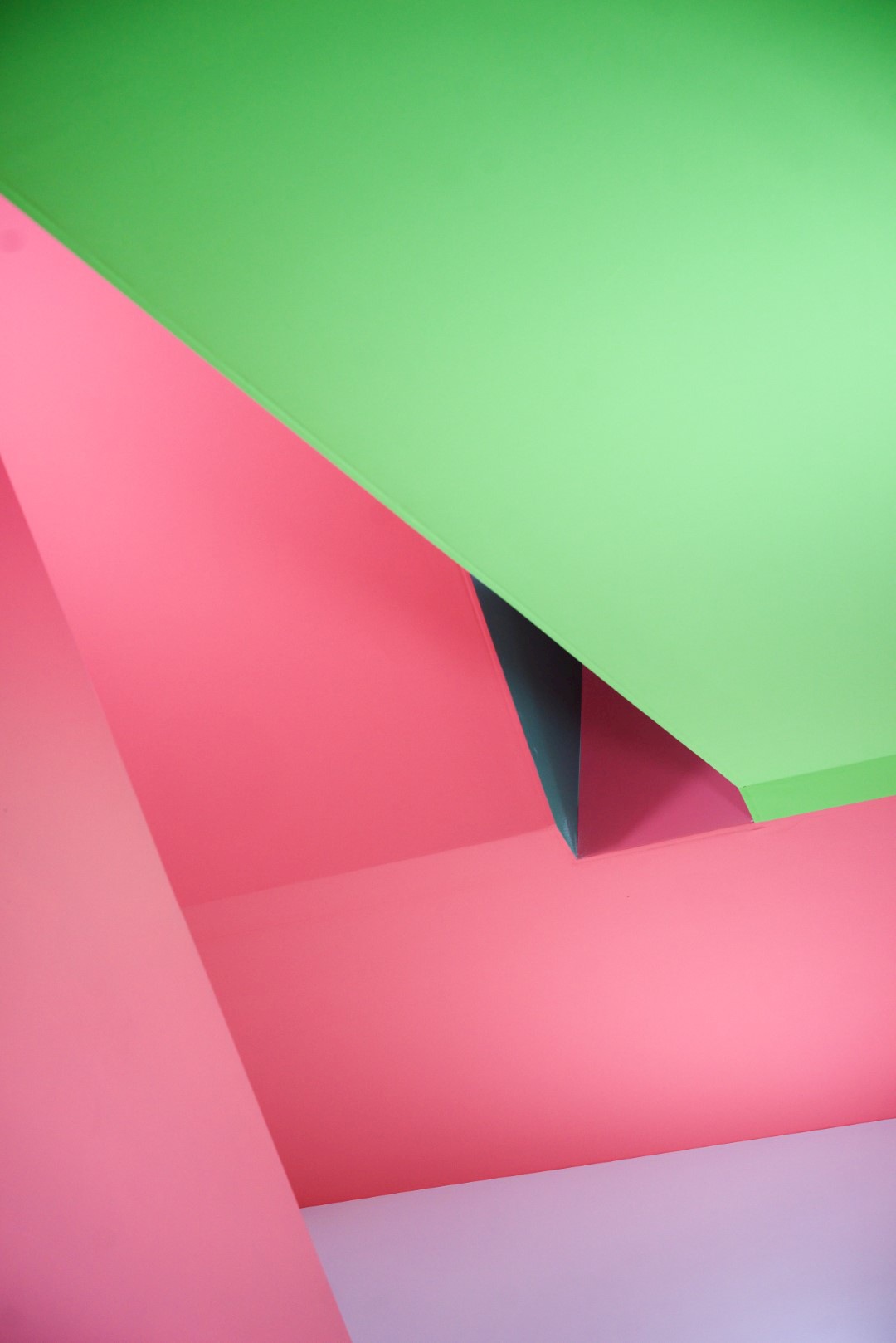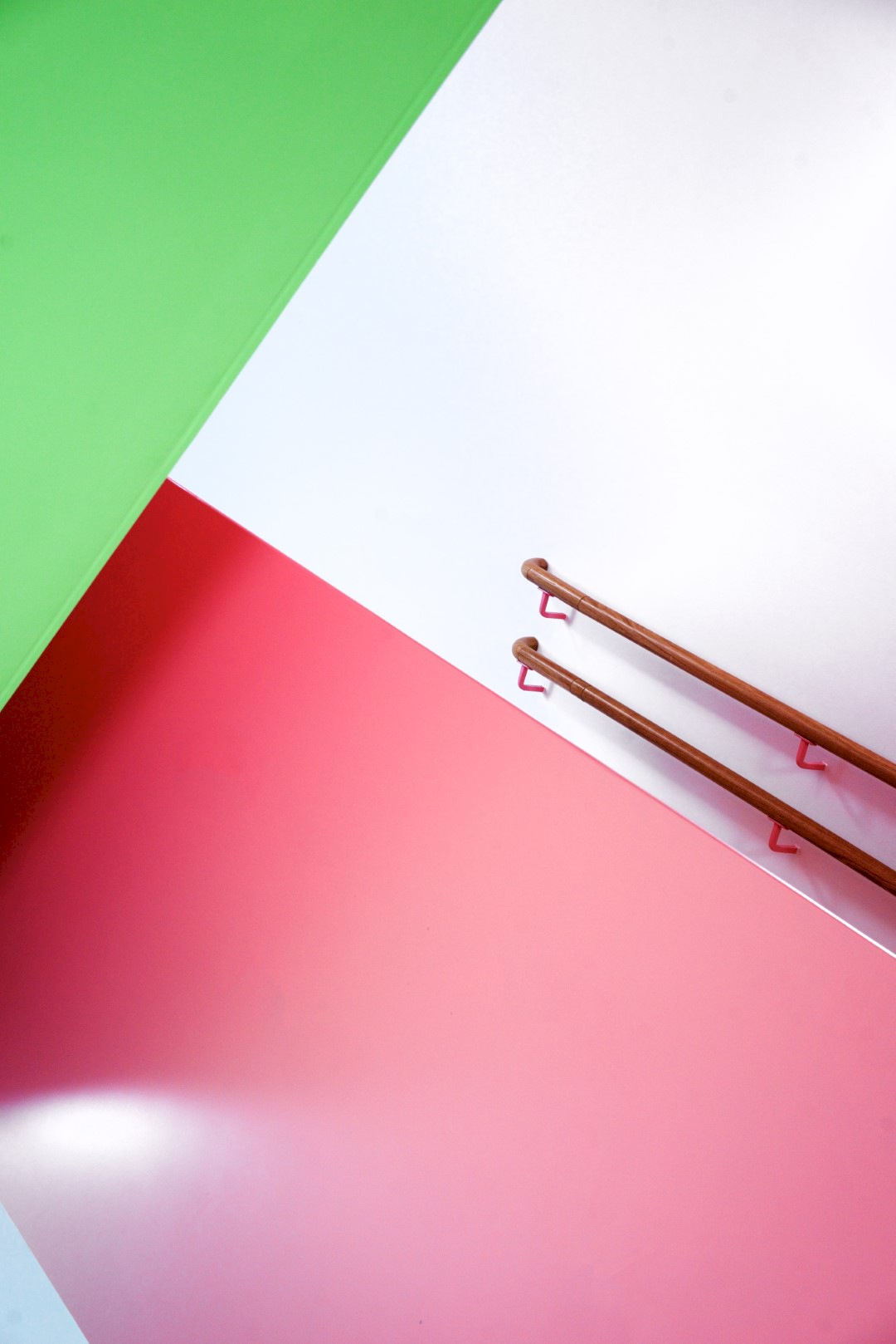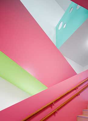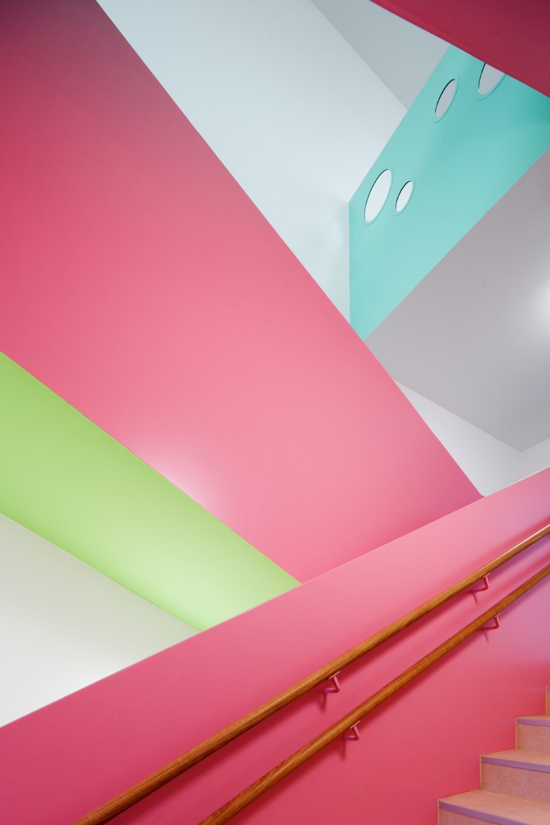 Die etagenweise Aufteilung spiegelt sich im Farbkonzept anhand farblicher Eyecatcher wider. Aus der Flurachse zurückspringende Garderobennischen sowie die Sanitärräume werden in der jeweiligen Etagenfarbe akzentuiert. Die Farbgestaltung der Treppenräume macht den Übergang zwischen den einzelnen Farben durch einen Farbverlauf an den Absturzsicherungen erkenntlich.