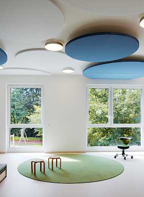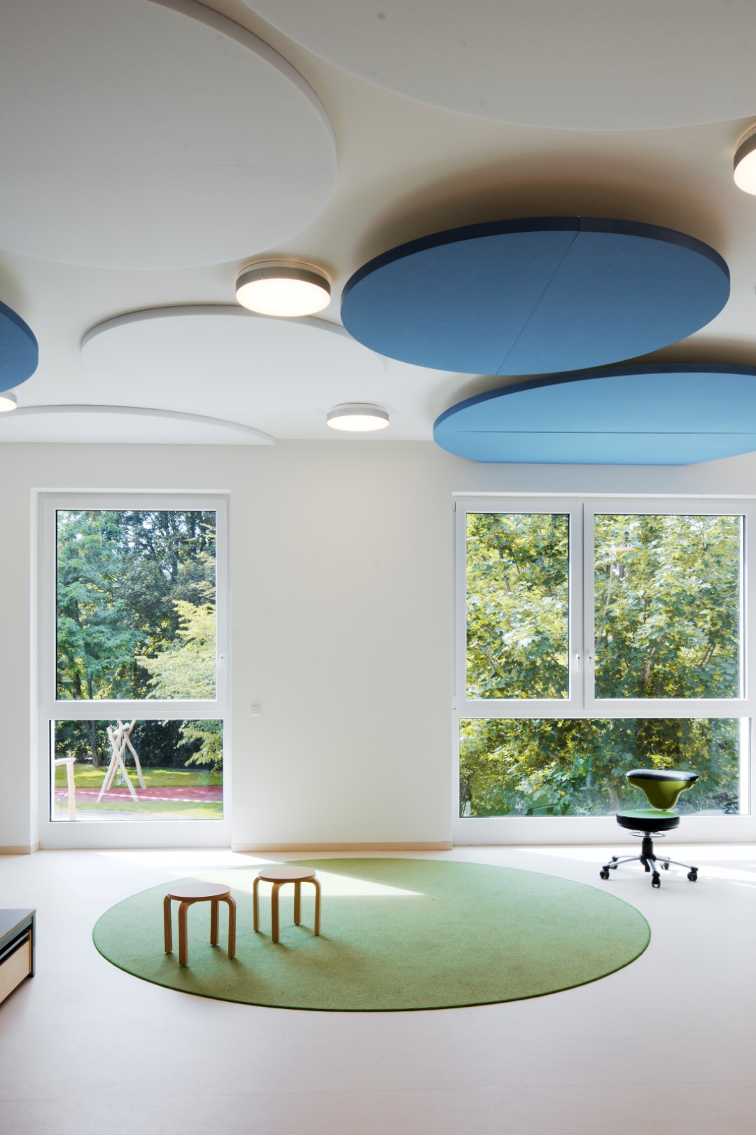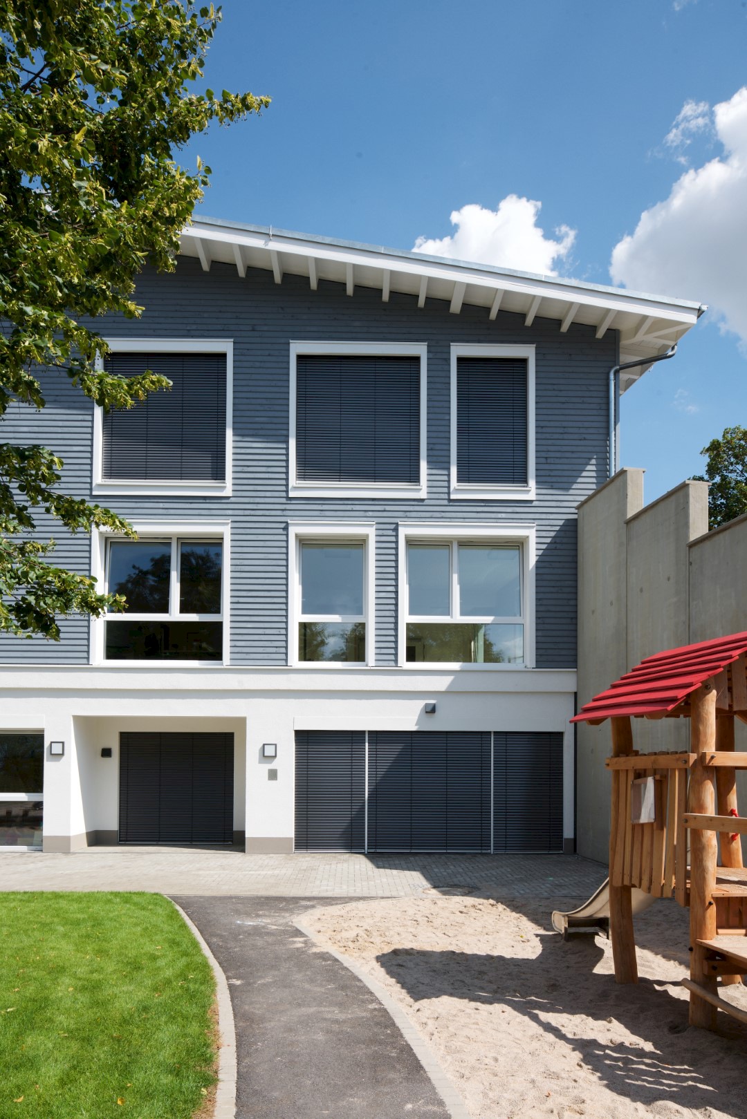 Zum Gartenbereich hin nach Westen öffnen sich die Gruppenräume mit großzügigen Fensterformaten und schaffen so eine lichtdurchflutete und vom Grün geprägte Atmosphäre.