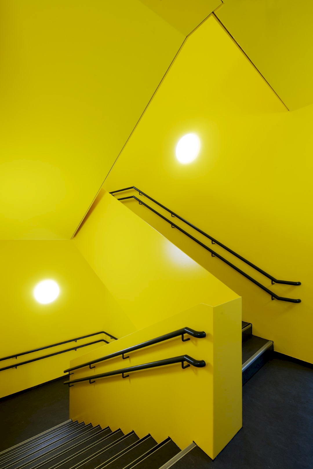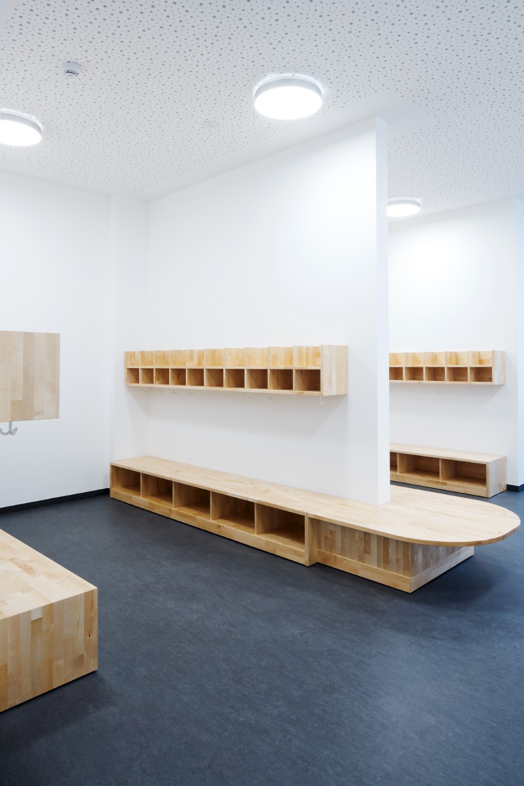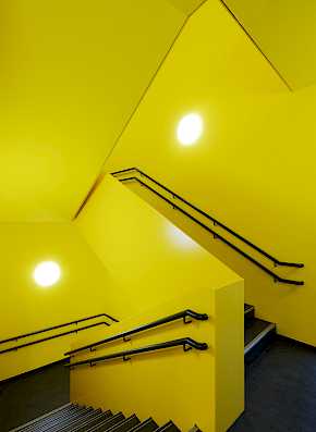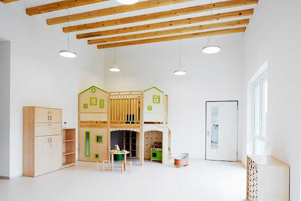 Über den Ausgang mit der Treppe erhalten die Gruppenräume einen direkten Zugang zum Gartenbereich, wodurch der übrige Betrieb der Kindertagesstätte ungestört und sauber bleibt. Straßenseitig finden sich die Funktionsräume, welche nicht für einen dauerhaften Aufenthalt der Kinder geplant sind. Die statische Struktur bildet dabei das Grundgerüst für die Gliederung der einzelnen Funktionen.