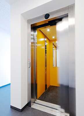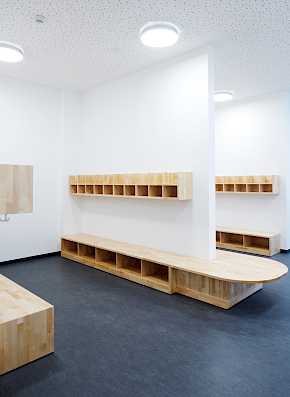 Erschlossen wird das Gebäude über einen großzügig verglasten Eingangsbereich, an den sich das Foyer mit Verbindung zum Mehrzweckraum mit einem Zugang zum Garten anschließt. Die offen gestaltete Raumabfolge: Eingang-Foyer-Mehrzweckraum- Garten gibt dem Gebäude beim Betreten Großzügigkeit und räumliche Identität.
