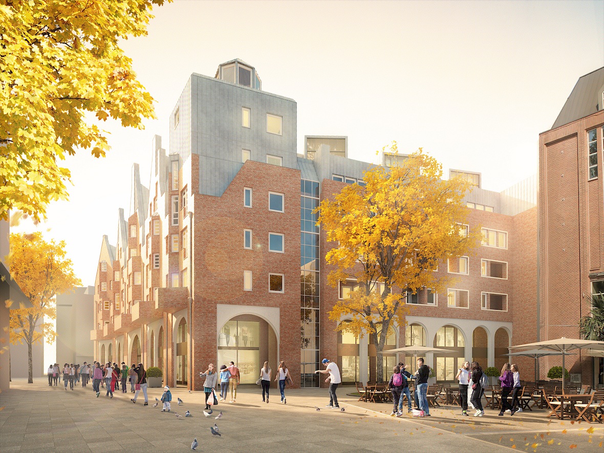 Der Sockel des Gebäudes wird umlaufend ausgebildet und unterstreicht den neuen Leitfaden des Gebäudes. Ziel dabei ist, das Gebäude trotz wechselnder Fensterformate und Geschosshöhen, zusammenzufassen und den Stadtbaustein in seiner Homogenität zu stärken. Um die Wirkung der Ladenzeile zu unterstreichen, erhält der Entwurf einen modernen Arkardengang, der durch seine Trichterwirkung die Besucher in seinen Bann zieht. Neben dem Vorteil des Wetterschutzes, bildet er einen Zwischenbereich aus, der die Wirkung der nach Innen-Gerichteten-Fassaden verstärkt.