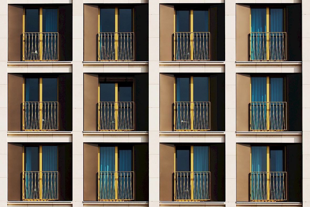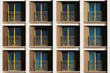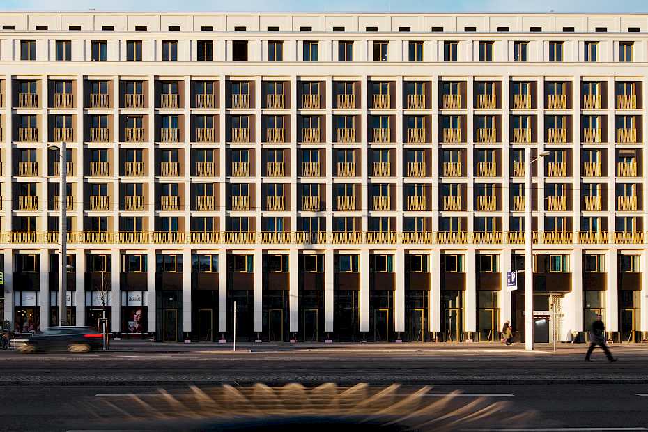 Die Fassadengliederung des Neubaus mit bodentiefen Fenstern und einem zweigeschossigen Sockelbereich besitzt eine klassisch-urbane Anmutung. Der über dem Sockelbereich befindliche durchlaufende Balkon zoniert das Gebäude ebenso wie die beiden Staffelgeschosse.