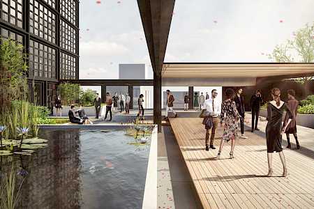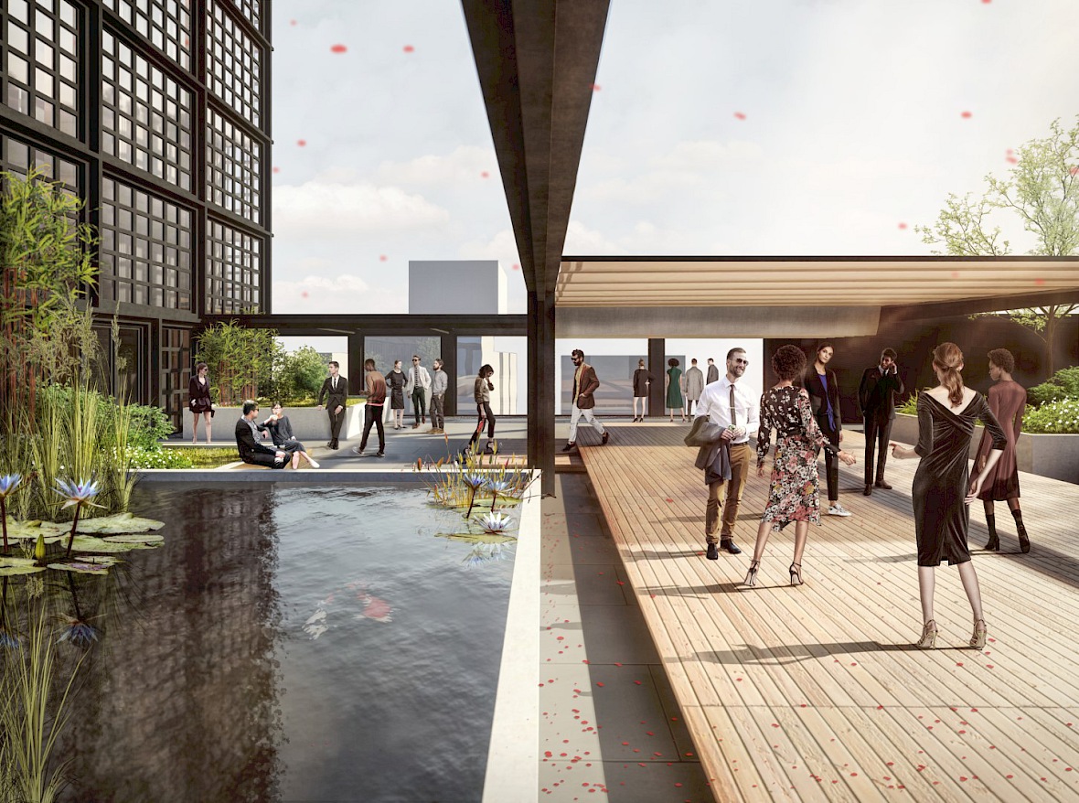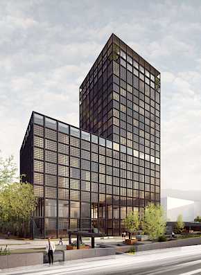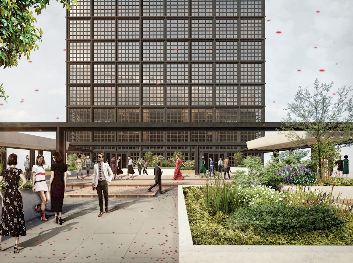 Das Fassadenbild wird im zweiten Untergeschoss unterbrochen und das engmaschige Raster wird durch großzügige Schaufenster ersetzt. Die vorgesehenen Einzelhandelsflächen erhalten so Aufmerksamkeit und setzen sich differenziert von den anderen Nutzungen ab. Das Foyer im Erdgeschoss wiederholt die aufgelockerte Struktur des zweiten Untergeschosses und schafft Orientierung für Gäste. Die Überdachung des Hoteleinganges verstärkt diese zusätzlich. Dieser Rhythmus setzt sich in den Etagen, die mit einer besonderen Nutzung belegt sind, fort und stärkt die Kubatur des Baukörpers.