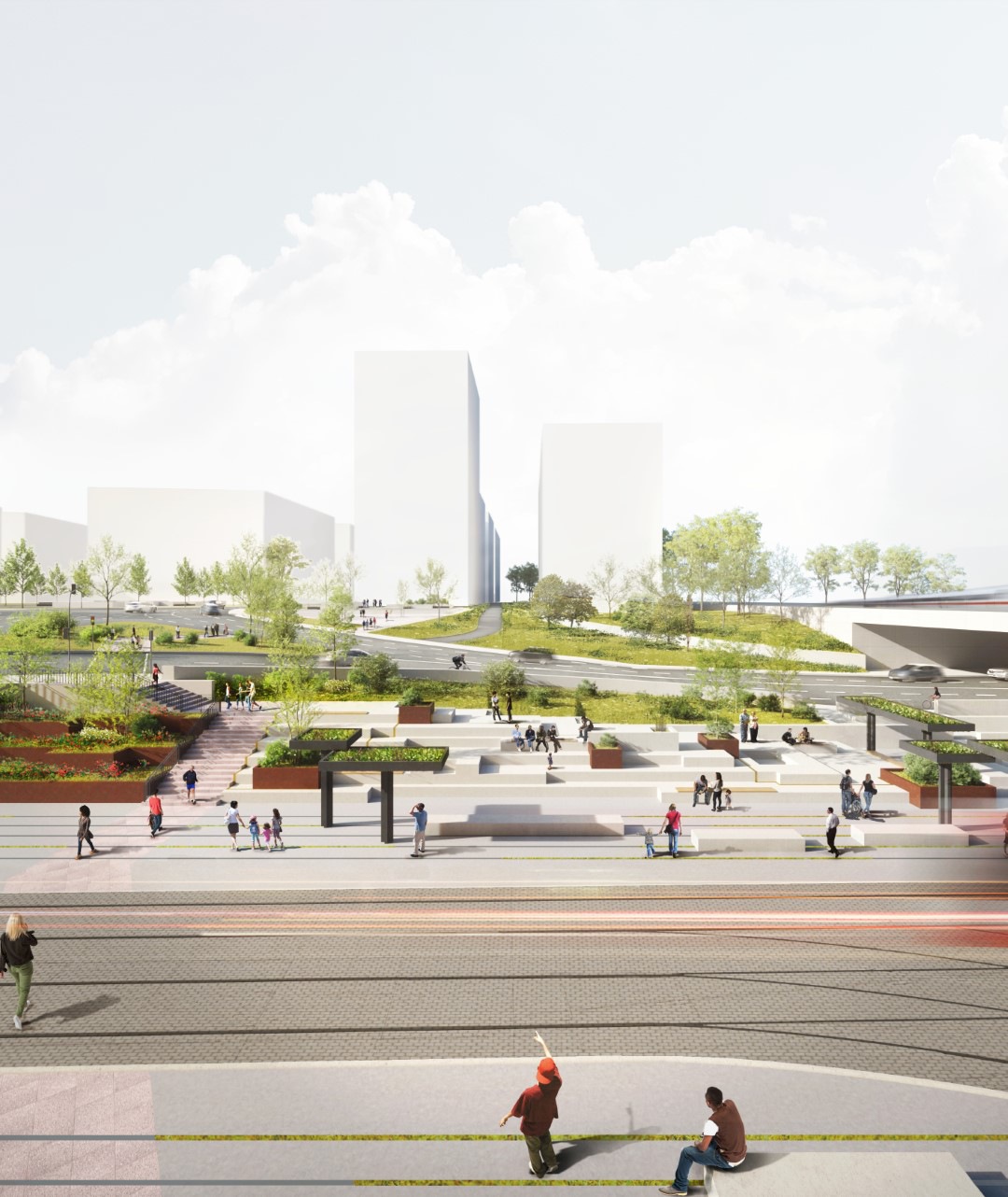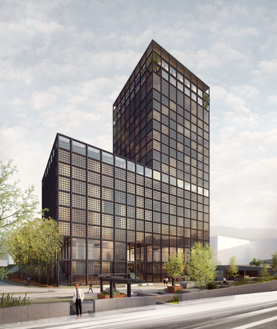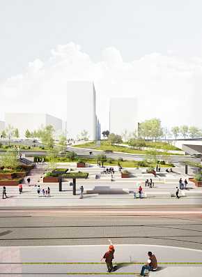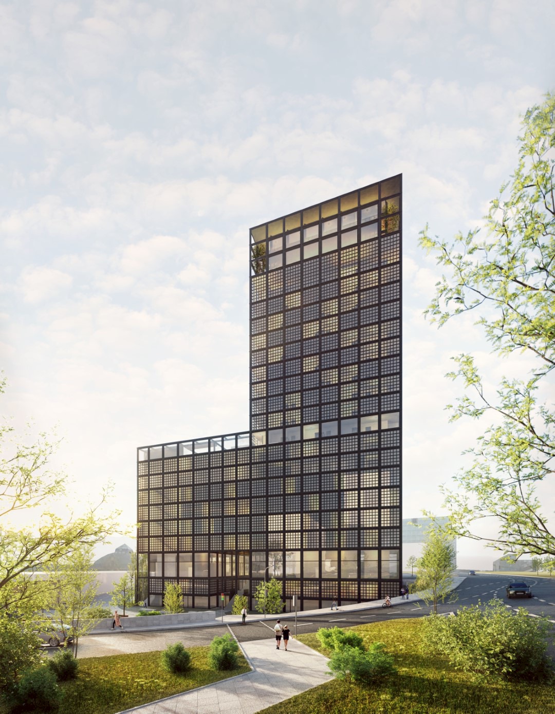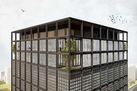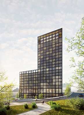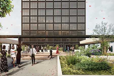 Äußere Gebäudegestaltung und Einbettung in den öffentlichen Raum unter Berücksichtigung von begrünten Flächen und Nachhaltigkeitsgesichtspunkten, Konferenzhotel und Büro in Halle an der Saale.