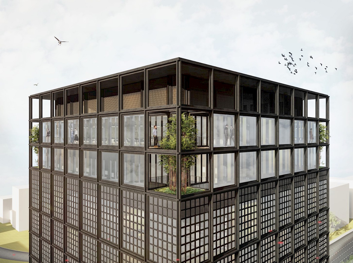 Die Konzeptidee der Fassade nähert sich an den urbanen Kontext des Bearbeitungsgebietes an. Der angrenzende Hauptbahnhof, sowie die Gleisanlagen der Straßenbahnen dienen als Inspiration. Es wird eine Pfosten-Riegel-Fassade vorgeschlagen, welche mit Aluminium Profilen als Hauptelement konstruiert ist. Die sich widerholenden vertikalen und horizontalen Profile erinnern an Gleise und greifen somit das von Urbanität geprägte Bild des Ortes auf. Die an den mannigfaltigen Verkehr angelehnte Farbwahl fügt den Neubau in den Kontext ein. Die gewählten Profile, sowie das Stützenraster ist auf die Kubatur des Gebäudes angepasst und prägt die Erscheinung des neuen Gebäudes. Die Fassade erreicht ihren Detailreichtum durch engmaschig gerasterte Sprossenfenster. So entsteht ein Fassadenbild mit räumlicher Tiefe. Die hohe Plastizität der Konstruktion kommt insbesondere in der Fernwirkung zur Geltung und spielt mit der Maßstäblichkeit. Sie strahlt Ruhe und Geradlinigkeit in dem hektischen Umfeld aus und verstärkt so den Ausdruck des Baukörpers im Stadtbild.