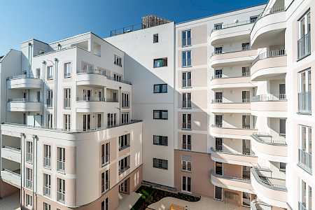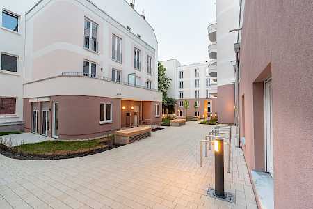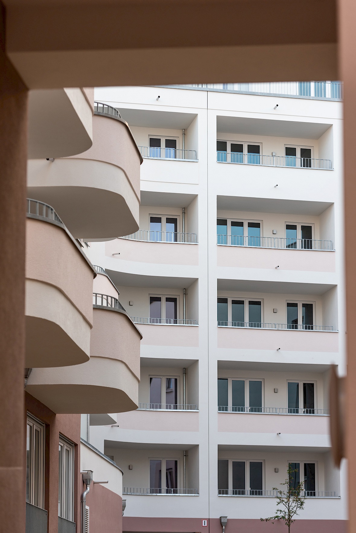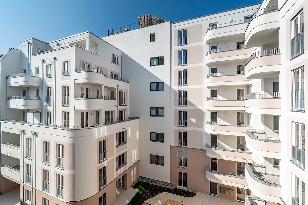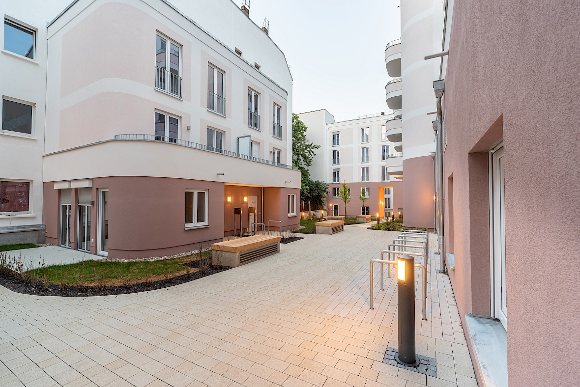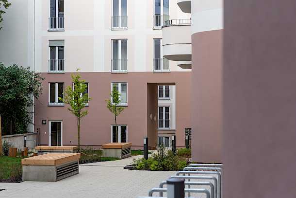 So entstehen drei Innenhöfe, die durch Übergänge miteinander verbunden sind. Sie sind mit Frei- und Spielflächen sowie Privatgärten gestaltet und bieten eine hohe Aufenthaltsqualität.
