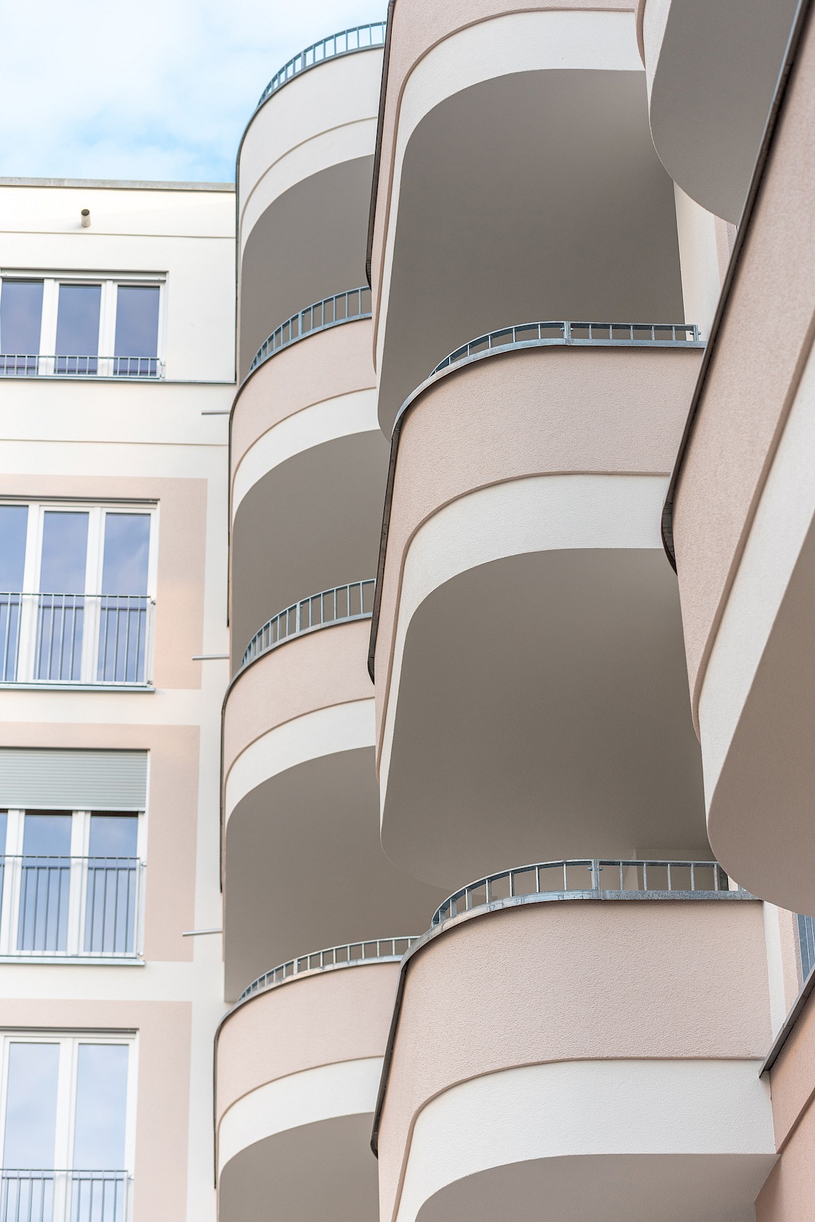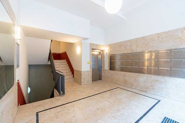 An das straßenseitige Gebäude anschließend befinden sich die Hinterhäuser, welche sich in ihrer Höhe an die Nachbarbauten anpassen. Ihre Fassaden sind weniger auffällig, das Sockelgeschoss setzt sich durch einen anderen Putz von den übrigen Geschossen ab und das Staffelgeschoss zieht sich optisch zurück.