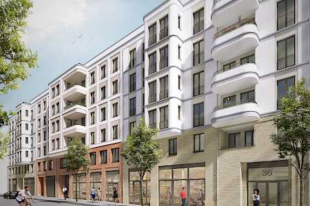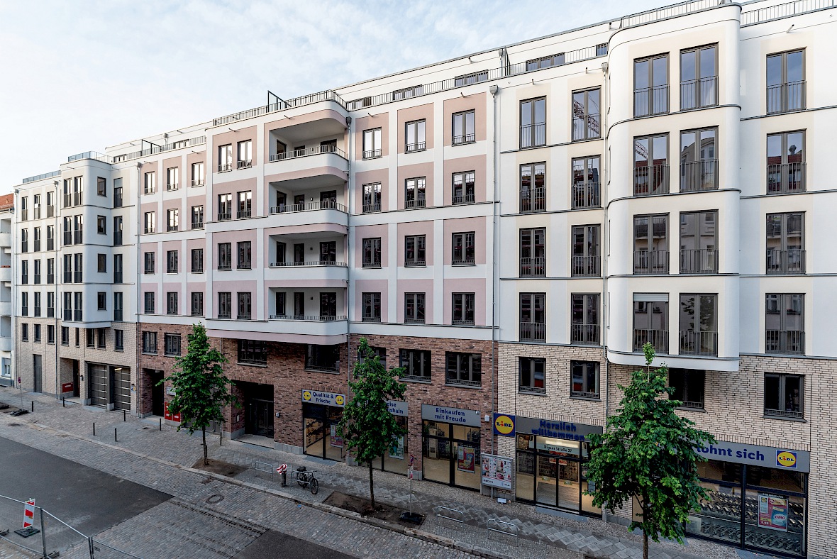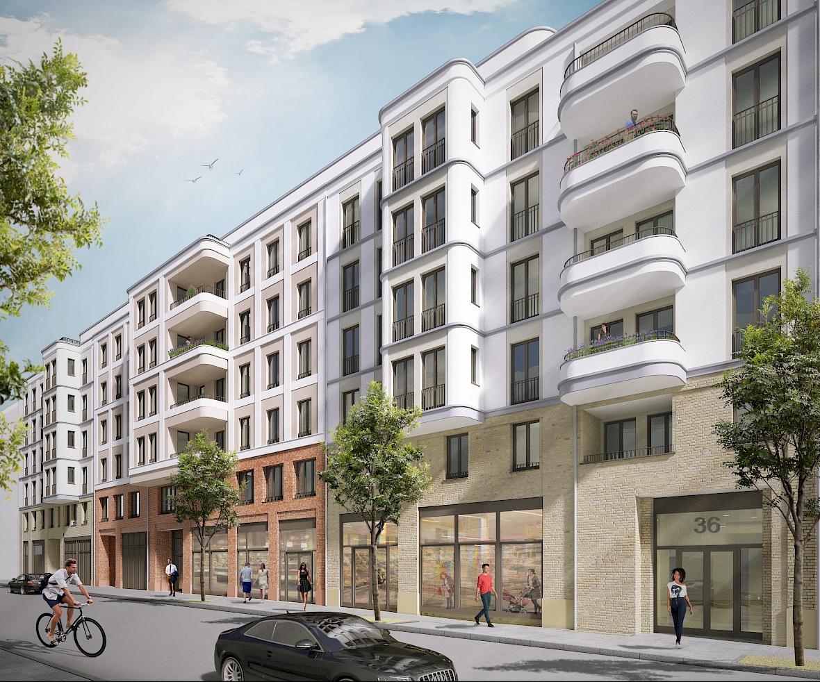 Errichtung eines Wohnquartiers mit 132 Wohneinheiten, gemeinschaftlicher Tiefgarage sowie einem Einzelhandel im Erdgeschoss in der Rigaer Straße 36-38, Berlin.