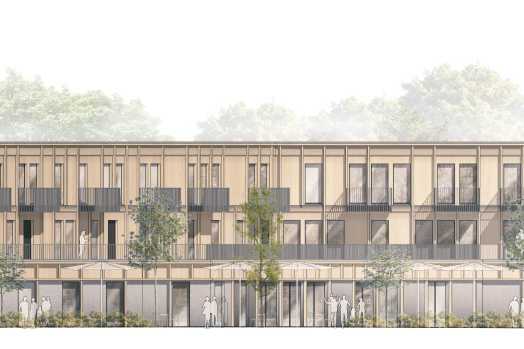 Zum Einsatz kommen Betonfaserplatten, welche das Sockelgeschoss ausbilden sowie eine umlaufende (nachhaltige) Holzverkleidung in den Obergeschossen. Die Zuordnung der Materialien macht die dahinterliegende Nutzung sichtbar und gliedert das Gebäude horizontal.