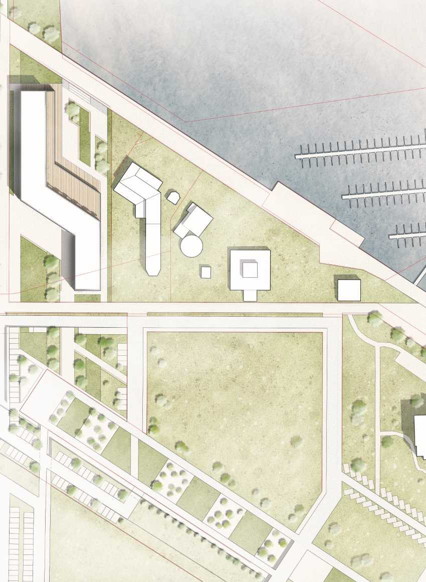 Die bestehende kleinteilige Bebauung durch Einzelbausteine wie die Bernsteinvilla, das Restaurant Seeblick“ und den Marinapark lässt das Gebiet auseinanderbrechen. Es fehlt ein eindeutiger Abschluss der Baufelder in Richtung Norden. Der Entwurf reagiert auf diese Problematik und setzt eine klare bauliche Kante zur nördlichen Bundesstraße. Der Ausgangspunkt einer durchlaufenden Kante wird durch partielles Einschieben der längsseitigen Gebäudefluchten gebrochen. Es entsteht eine S-Form. Der Mittelsteg greift die Uferkante auf und ermöglicht so die Orientierung der größtmöglichen Anzahl an Nutzungseinheiten in Richtung Wasser. Vor allem die Einheiten in den Obergeschossen können so einen 3-seitigen „Über“-Blick auf den Großen Goitzschesee genießen. Die Einzigartigkeit des Gebietes wird so optimal ausgenutzt. Die Kantenbildung zur Straße reduziert weiterhin die Lärmemission der Bundesstraße über das Planungsgebiet hinaus auf alle anderen rückwärtigen Baufelder.